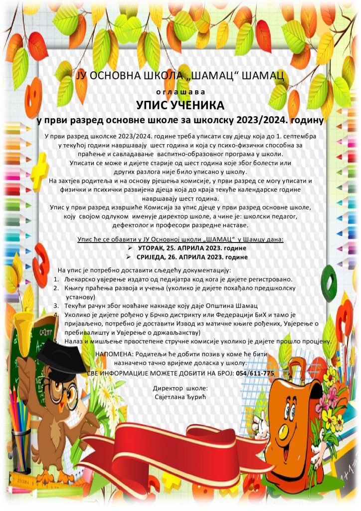 Упис ће се обавити у ЈУ Основној школи „ШАМАЦ“ у Шамцу дана:
