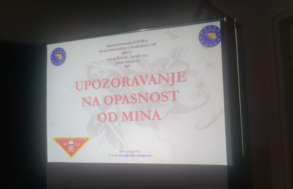 Мине представљају посебну опасност јер су скривене, тешко се уочавају и долазе у разним облицима, па су предавачи истакли да је веома важно бити опрезан уколико се посјећују мјеста високог ризика, као што су бивше линије разграничења, рушевине, напуштене зграде и куће, непознате или удаљене зарасле површине, те стратегијска и војна подручја.